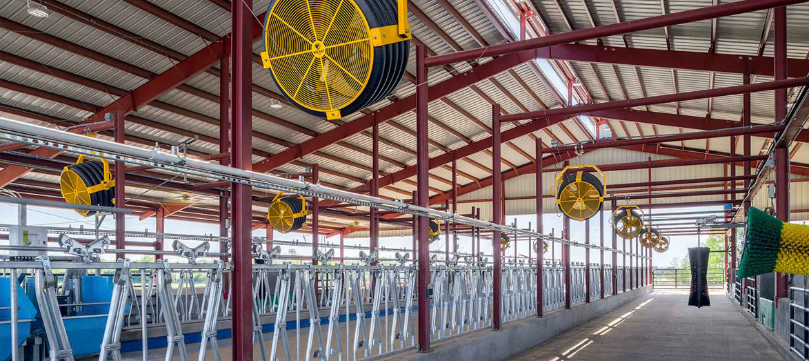 Otro factor es el invierno, hace mella en su salud y en el resultado final de una granja. Cuando los animales tienen frío, tienden a comer más, lo que aumenta drásticamente la cantidad de consumo de forraje. Los ventiladores industriales con el sistema HVLS, desestatifican el aire del establo con circulación inversa para Mantener al ganado más cómodo incluso en invierno.