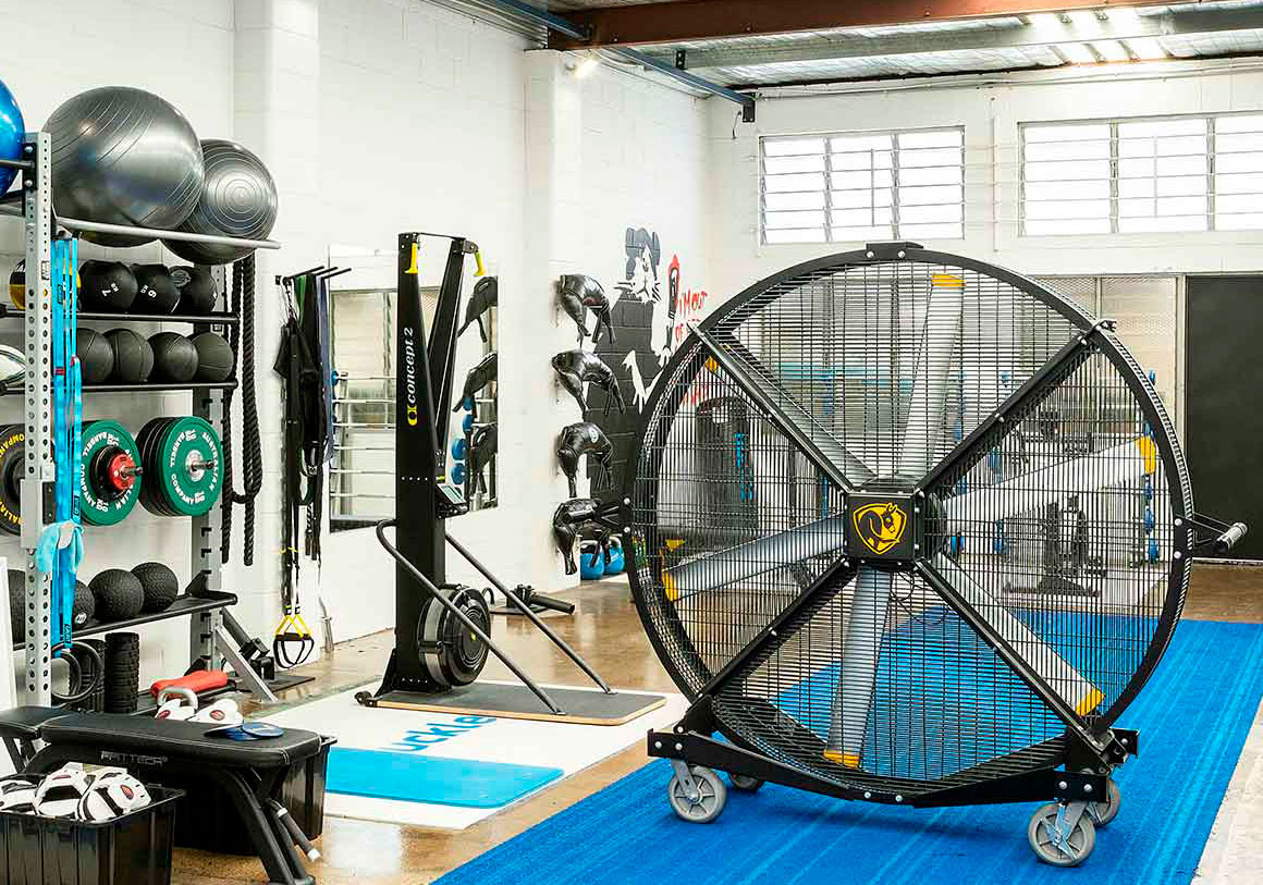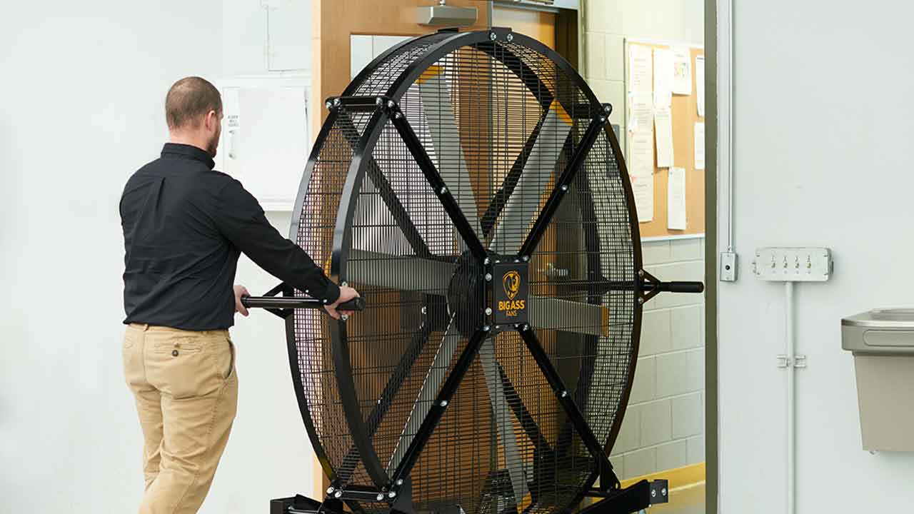 Diseñamos el ventilador Black Jack® con una estructura de 2 metros (6,5 pies) para posibilitar su paso por puertas interiores estándar y con ruedas de goma aptas para uso interior y exterior adaptables a cualquier terreno. Es perfecto para cualquier espacio, desde pasillos estrechos hasta talleres mecánicos concurridos, bodas al aire libre y gimnasios. Le pusimos manijas en ambos lados y lo hicimos liviano y maniobrable para que una persona sola pueda moverlo fácilmente.